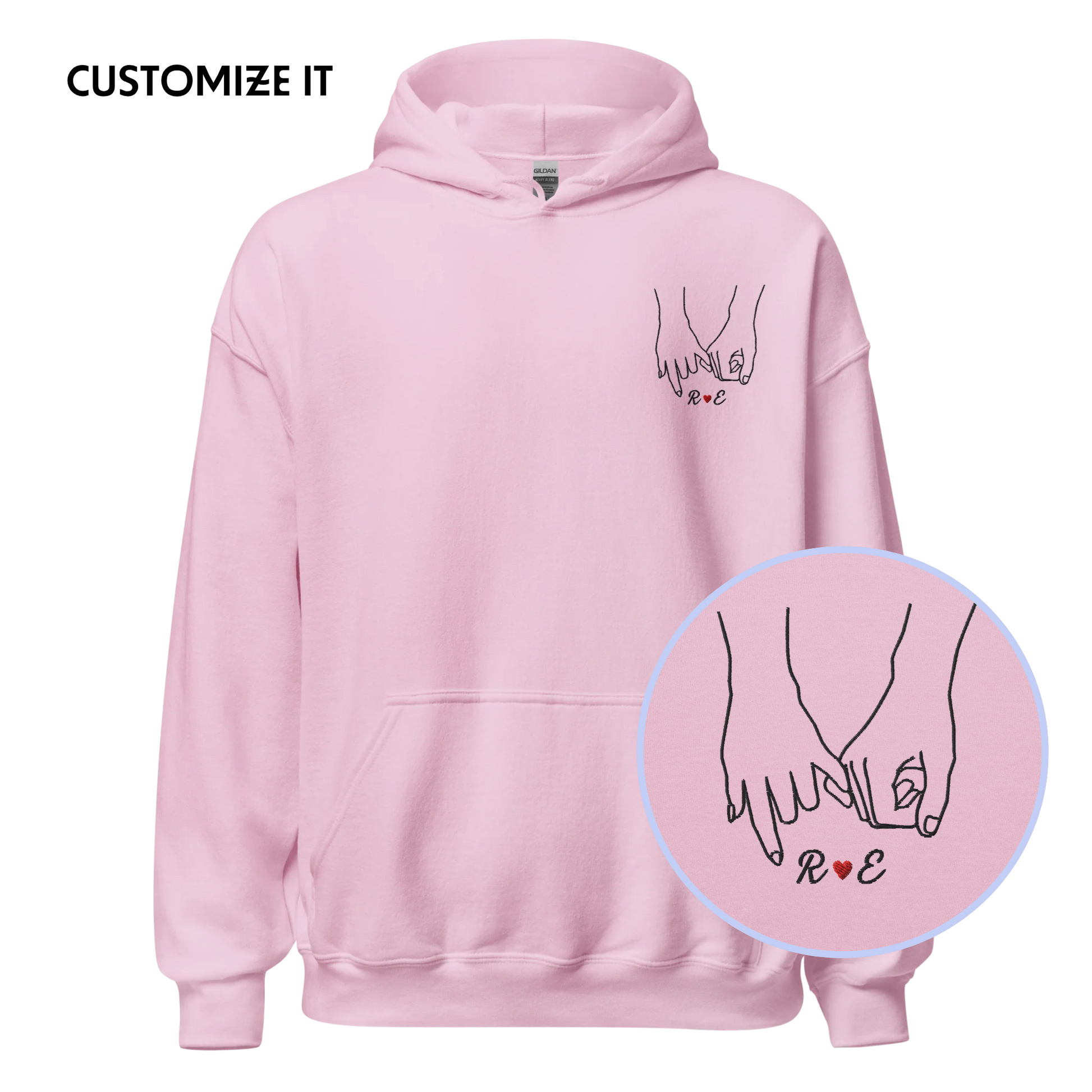The CUSTOM Couple Initials Embroidered Hoodie is the perfect cozy way to celebrate your favorite person. Featuring a delicate embroidery of two hands intertwined and your custom initials, it’s a subtle yet heartfelt reminder of your connection. Made from a soft, premium cotton blend with a relaxed fit, this personalized couple hoodie is ideal for everyday wear - comfy enough for lounging, cute enough for date nights. Thoughtful, romantic, and completely one-of-a-kind, it makes the perfect gift for anniversaries, Valentine’s Day, birthdays, Christmas, or just because. Whether you’re matching with your partner or gifting it as a keepsake, this hoodie is made to celebrate love in every form.