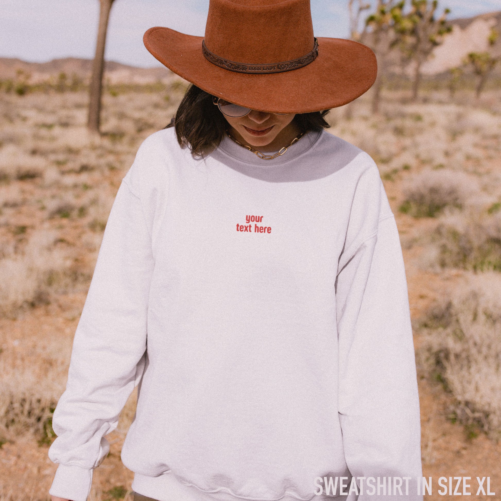 The CUSTOM Your Red Text Embroidered Sweatshirt is all about making your words come to life in the coziest way possible. Whether it’s a funny quote, a meaningful phrase, or something personal to you, this sweatshirt lets you express yourself with style. With high-quality embroidery and a comfy fit, it's the perfect way to wear your thoughts and make a statement, all while staying warm and stylish!