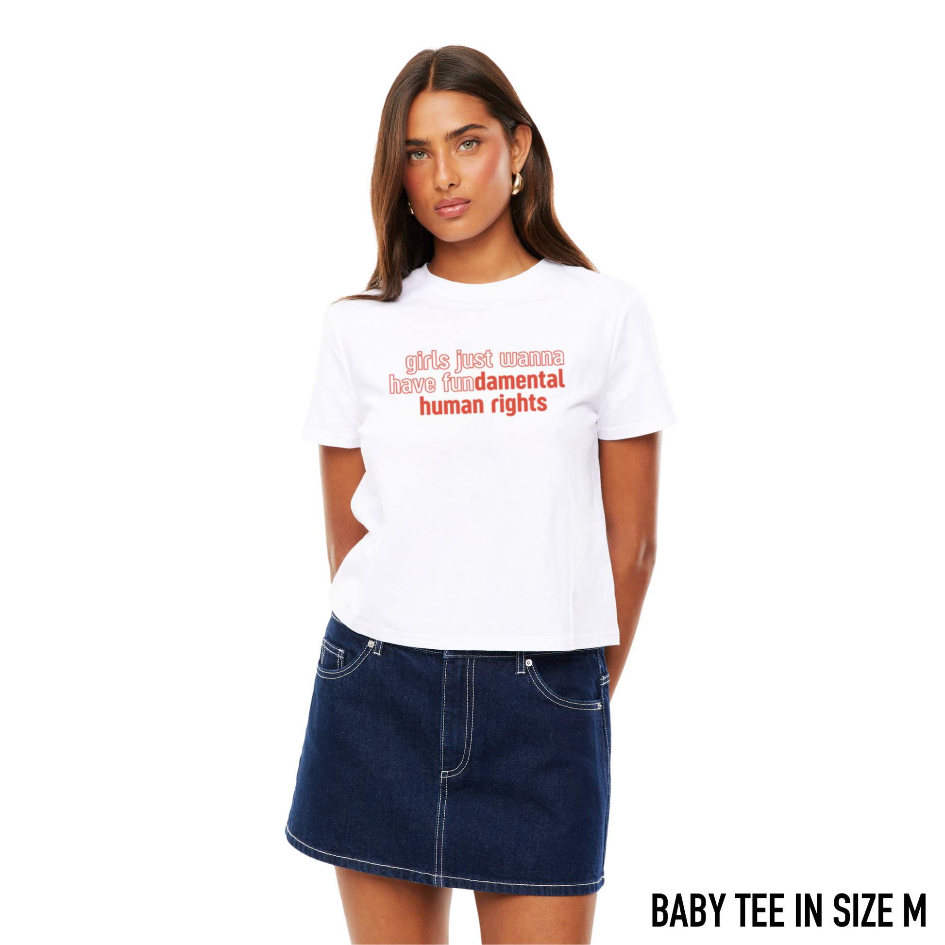 The Girls Fundamental Human Rights Baby Tee is a simple yet powerful statement piece. With a bold message and a flattering fit, this tee is perfect for those who believe equality isn’t optional — it’s essential. Wear it loud, wear it proud, and remind the world that fundamental rights are not up for debate.